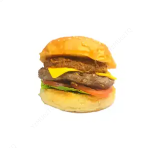 Hamburguesa con carne de res de 150 gr, carne de pollo de 150 gr, doble porción de queso, maíz tierno, trozos de tocineta y cebolla, salsa de la casa.