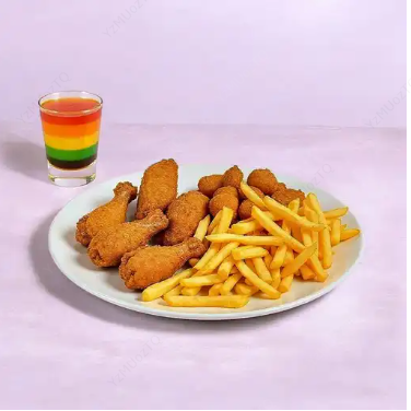 Alitas, nuggets, papas francesas y jugo.