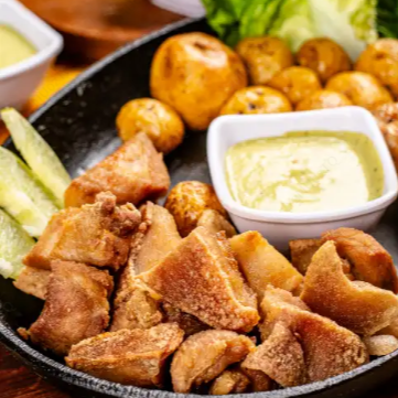 250 gr de chicharrón junto con 200 gr de papa criolla.