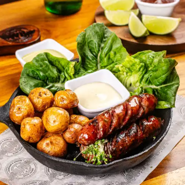 Rellena, chorizo, pechuga, carne de res, costillas, chicharrón, yuca, papa criolla, guacamole, salsa BBQ, chimichurri.