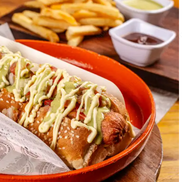 Papa francesa, salchicha americana, pico de gallo, queso mozzarella, lechuga, maíz tierno, guacamole y salsa chipotle.