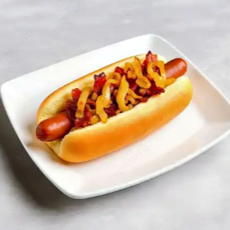 Salchicha americana, cebolla caramelizada y tocineta.
