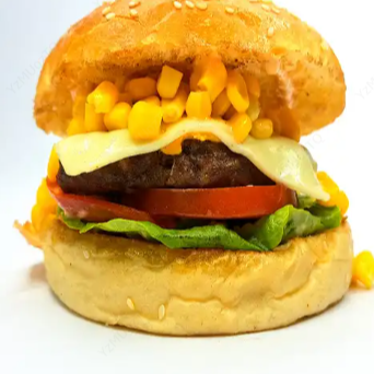 Hamburguesa con carne de res, queso, maíz tierno, lechuga y salsa de la casa.
