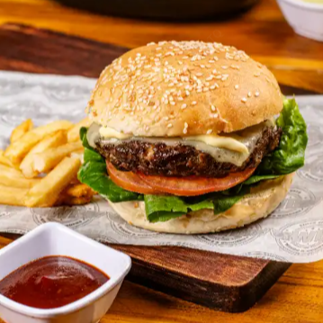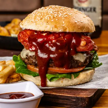 Hamburguesa con carne de res, queso, trozos de tocineta, cebolla, lechuga y salsa BBQ.