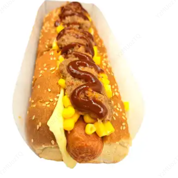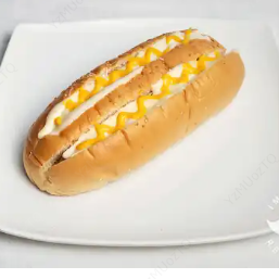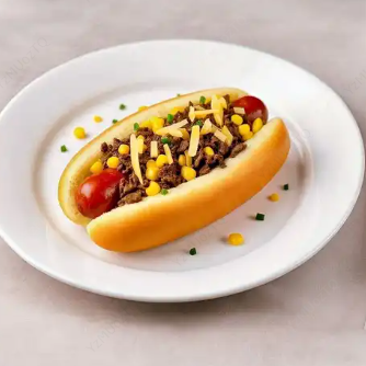 Hot dog con salchicha americana, carne desmechada, maíz tierno y queso.