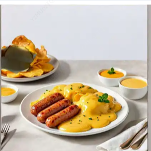 Salchicha americana, carne desmechada, maíz tierno y queso.