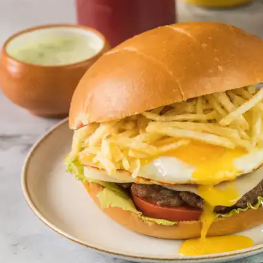 Hamburguesa con 2 carnes de res de 150 gr, queso cheddar, tocineta, pepinillos, lechuga, tomate.