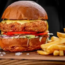 Hamburguesa con pechuga de pollo crujiente, queso cheddar, tomate, tocineta, lechuga, pan gold y salsa casa.