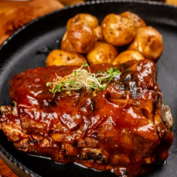Costillas ahumadas de 350 gr, selladas a la parrilla, bañadas en salsa BBQ, ensalada de la casa, guacamole y papa casco.
