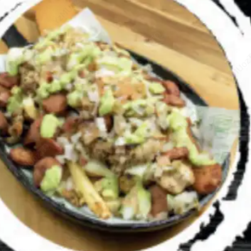 Papa francesa, salchicha americana, carne desmechada, pollo desmechado, maíz tierno, guacamoles, pico de gallo, nachos, salsas de la casa.