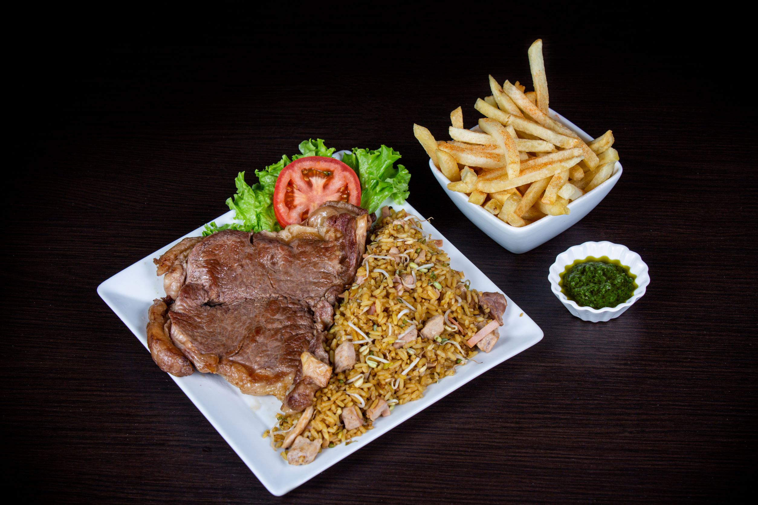 Arroz chino, churrasco y papa francesa.