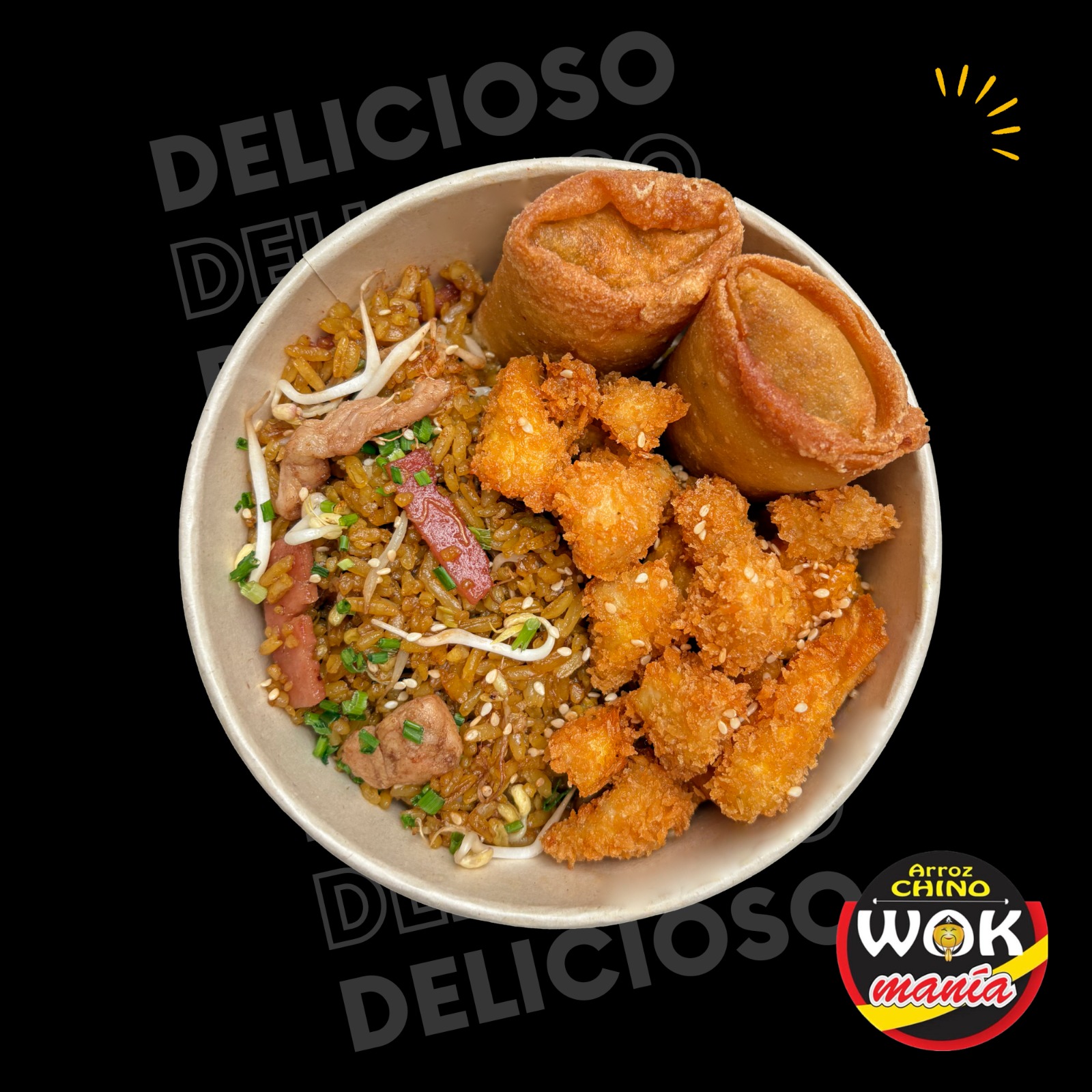 Arroz mixto (Jamón, camarón, cerdo raíz china) + 300gr de bolitas de cerdo o pollo agridulce + 2 lumpias