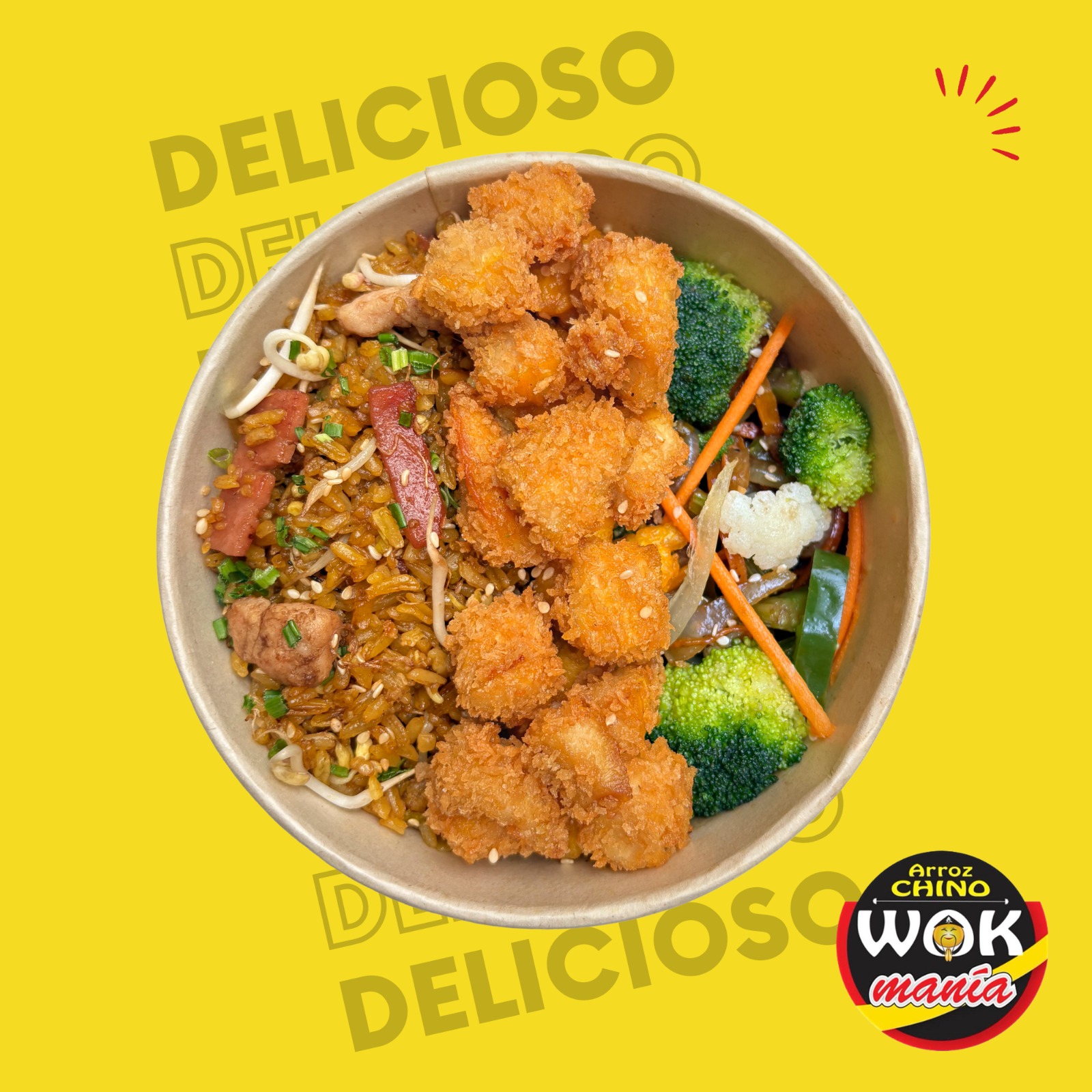 Arroz mixto, bolitas de pollo, vegetales al wok
