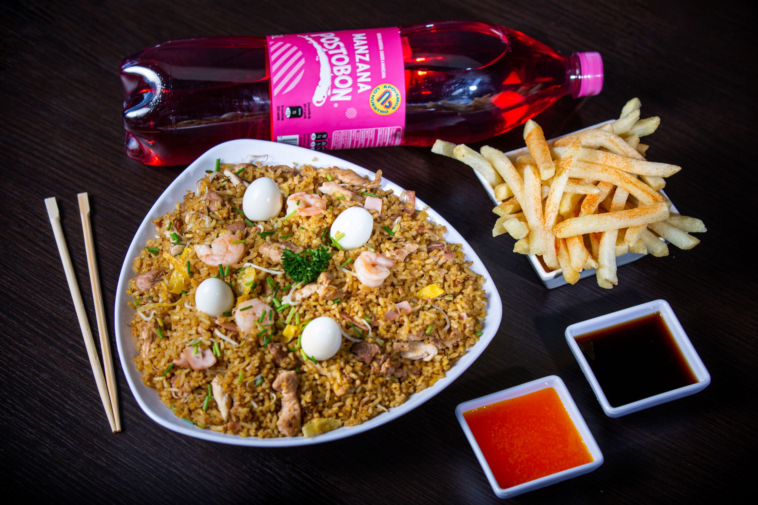 Arroz con pollo, cerdo, jamón, camarón, raíz china, huevos de codorniz, gaseosa 1,5L y papa francesa