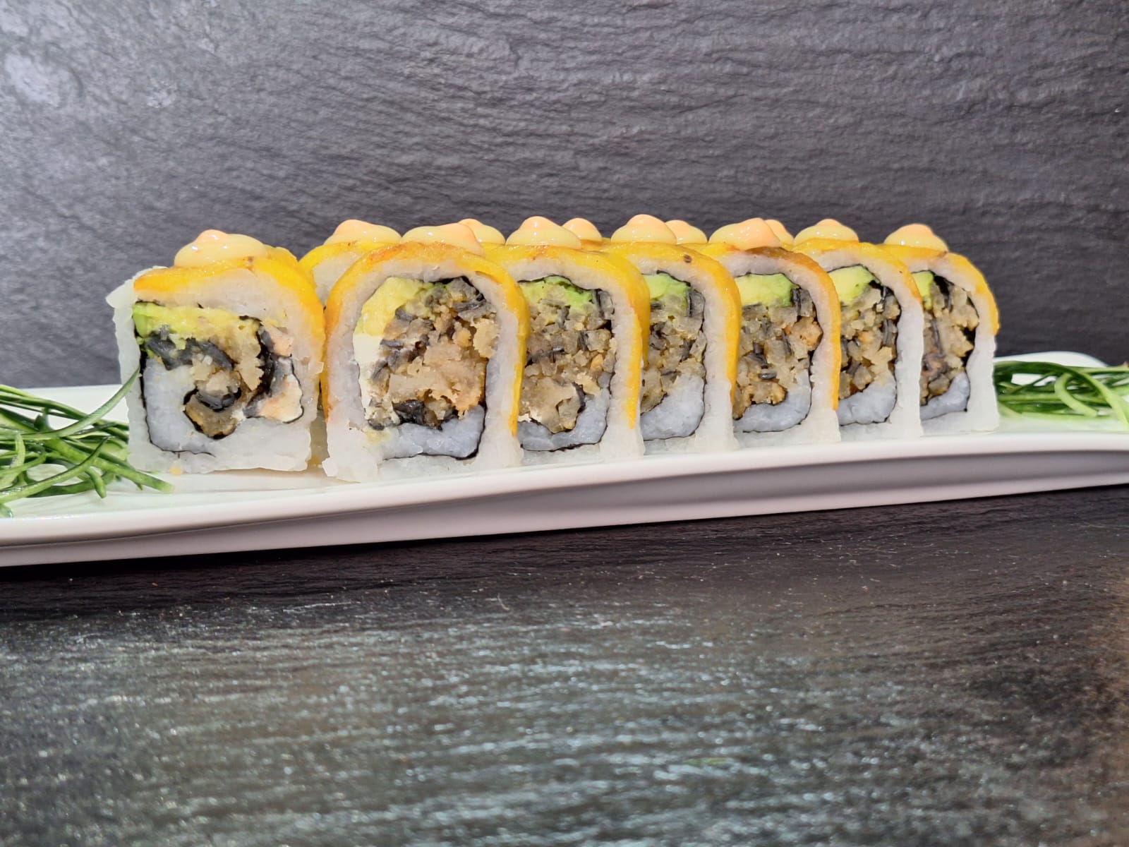 Centro de palmito, salmón, atún, tempura, massago y topping de ajonjolí.