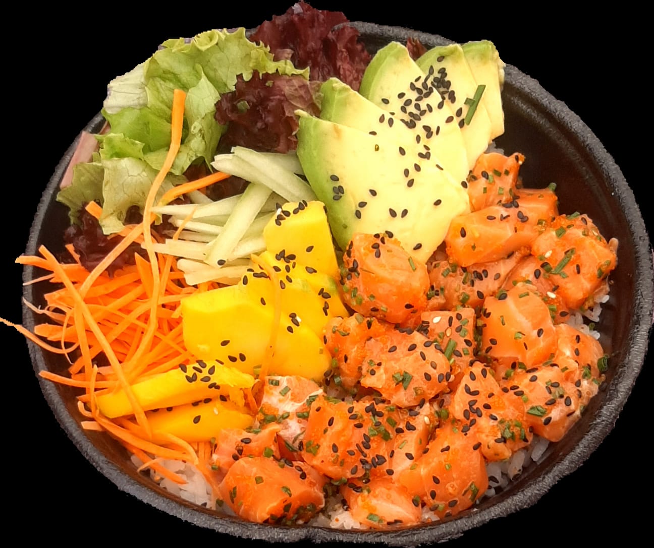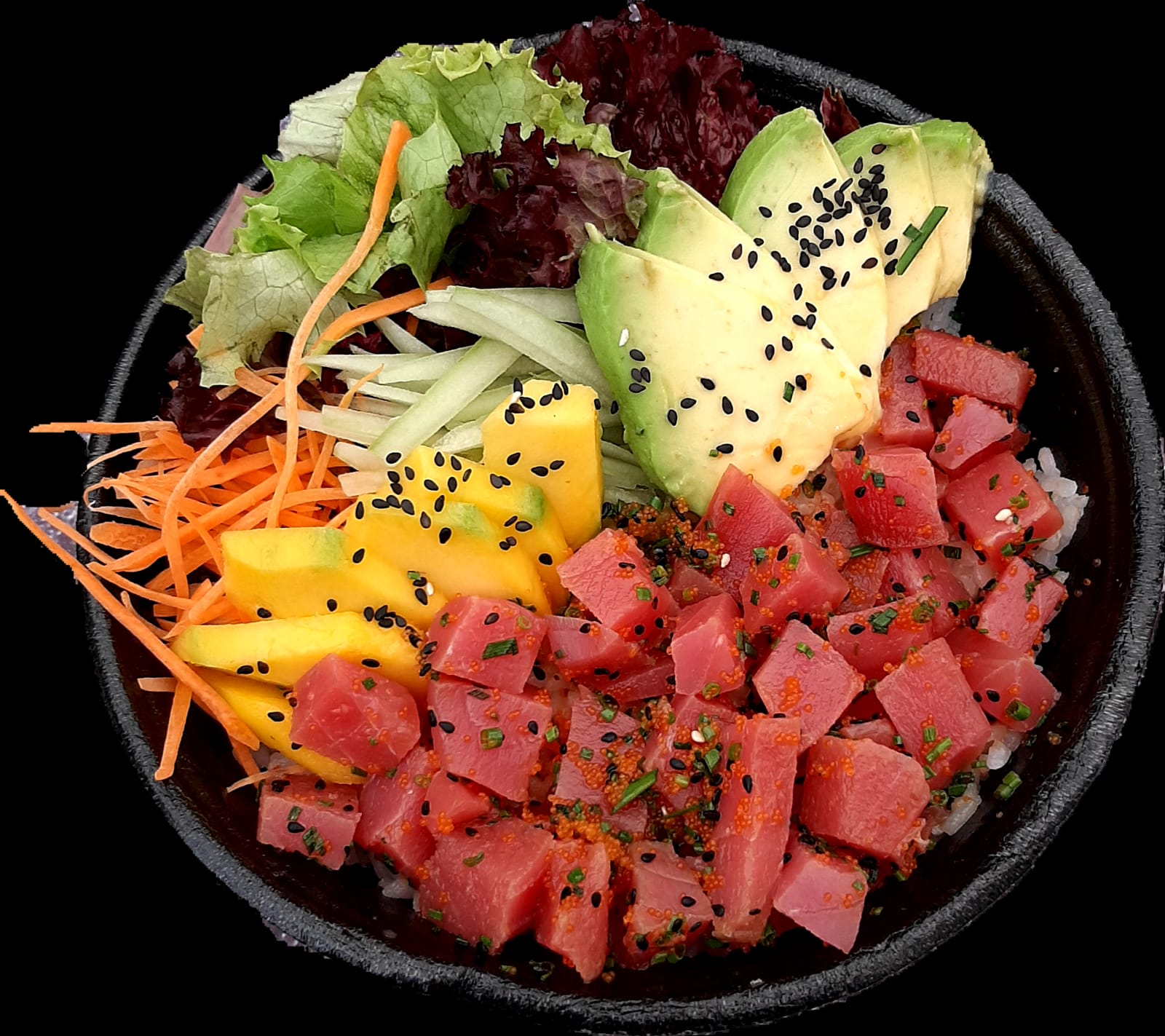 Base de arroz de sushi lechuga, pepino, aguacate, mango y zanahoria aderezado con salsa ponzul y ajonjolí.