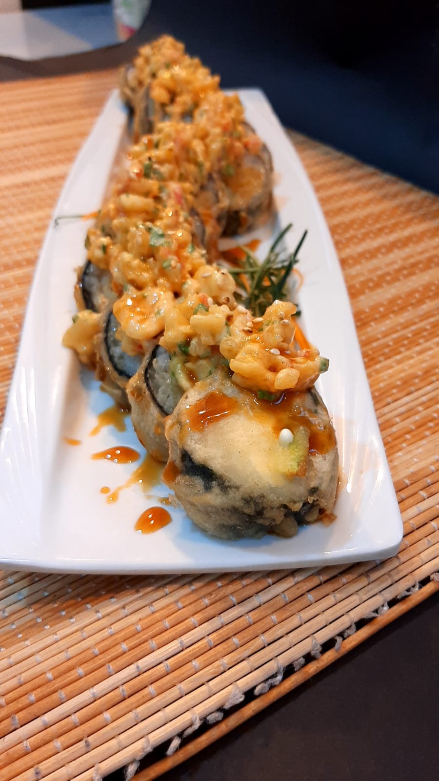 vegetales crocantes, camarones crocantes y queso crema, topping de ajonjoli, salsa fuji y salsa teriyaki.
