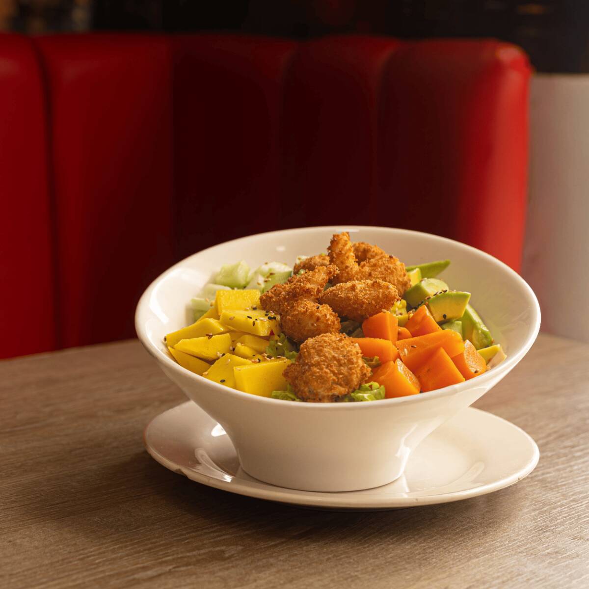 Camarones sobre base de arroz salteado acompañados de lechuga fresca, pepino, mango, zanahoria y aguacate, todo realizado con nuestra deliciosa salsa ponzu.