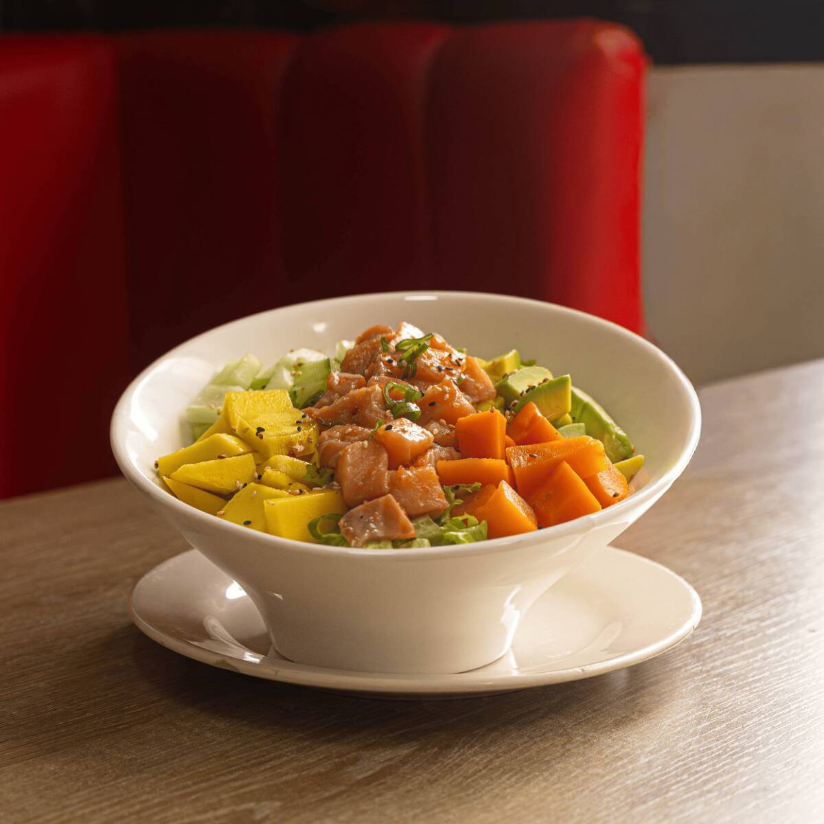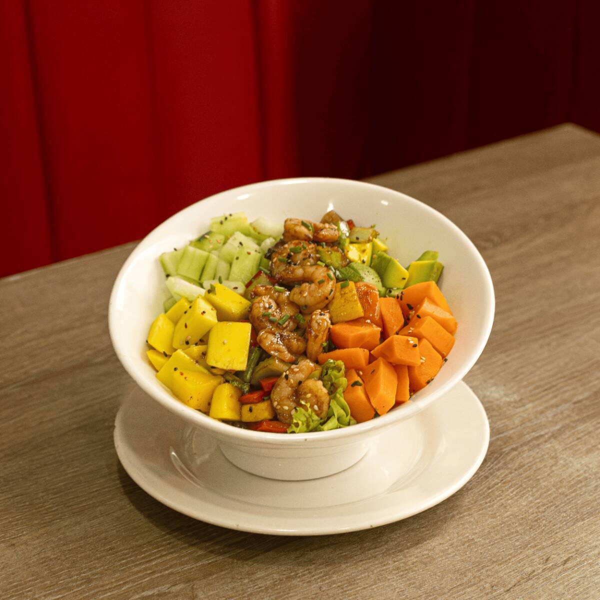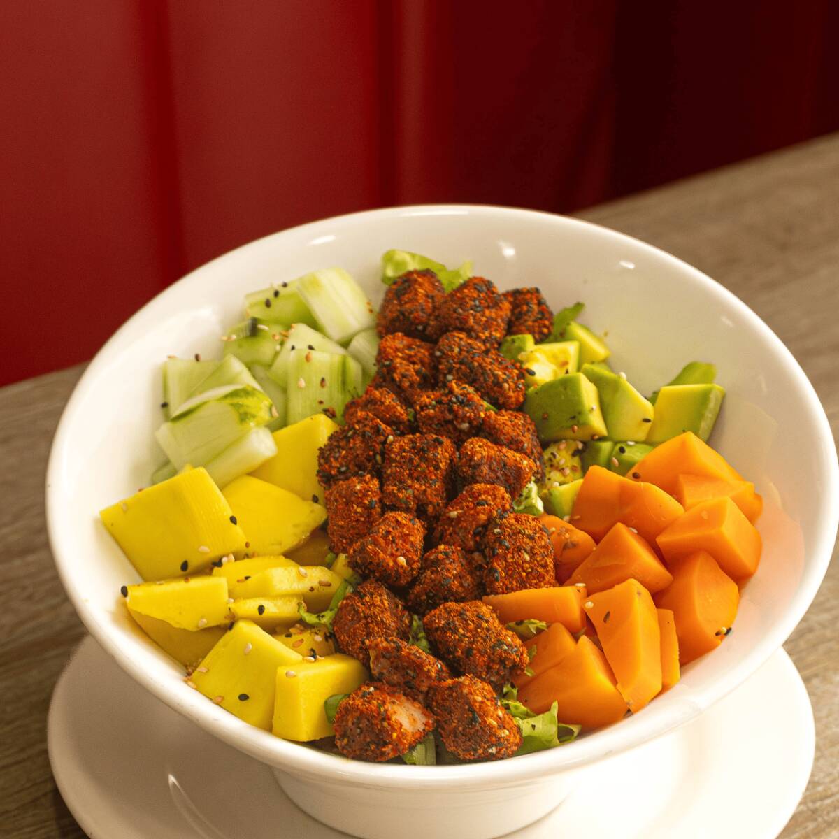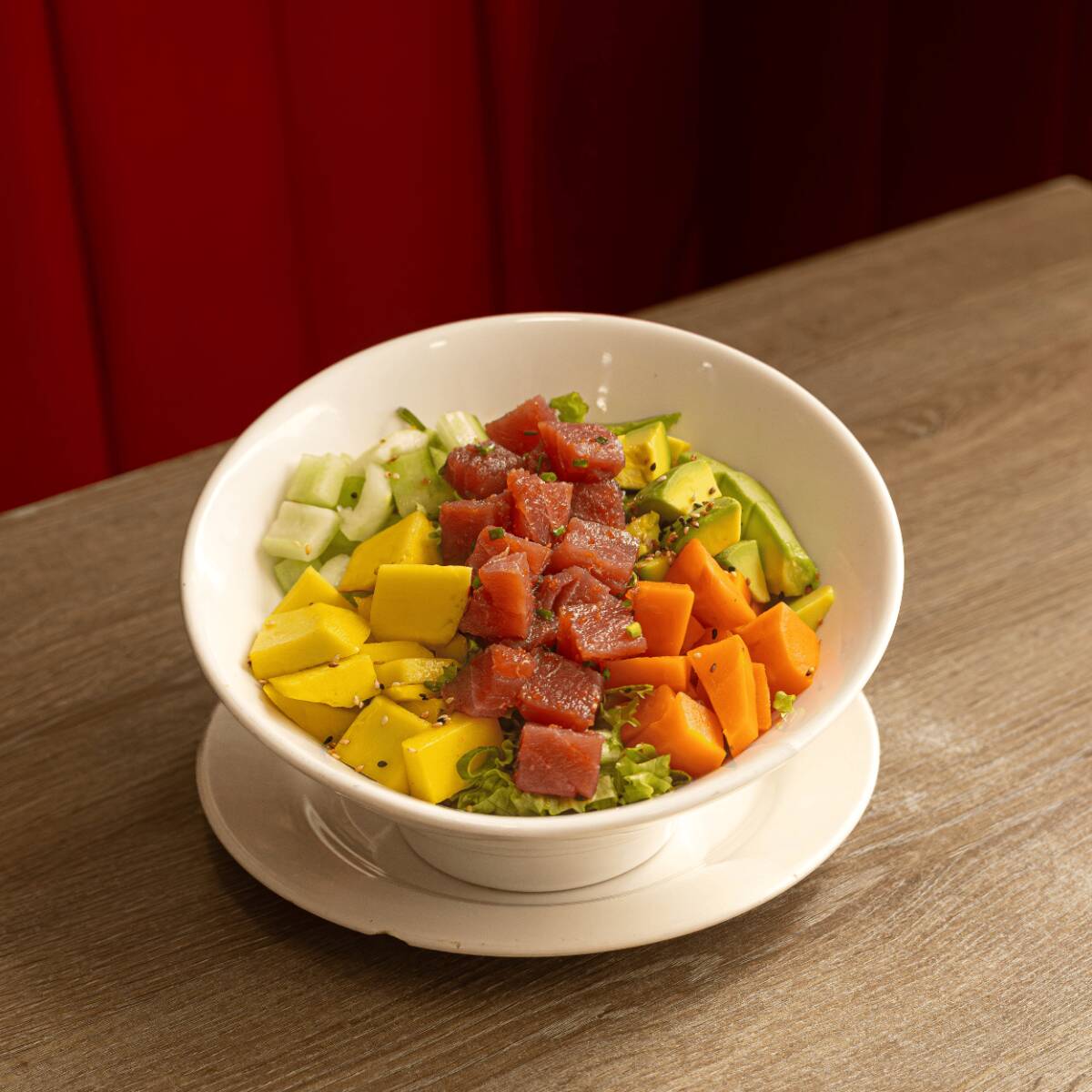 Delicados cubos fresco sobre arroz de sushi, acompañados de lechuga, pepino, mango, zanahoria y aguacate, bañados con salsa ponzu.