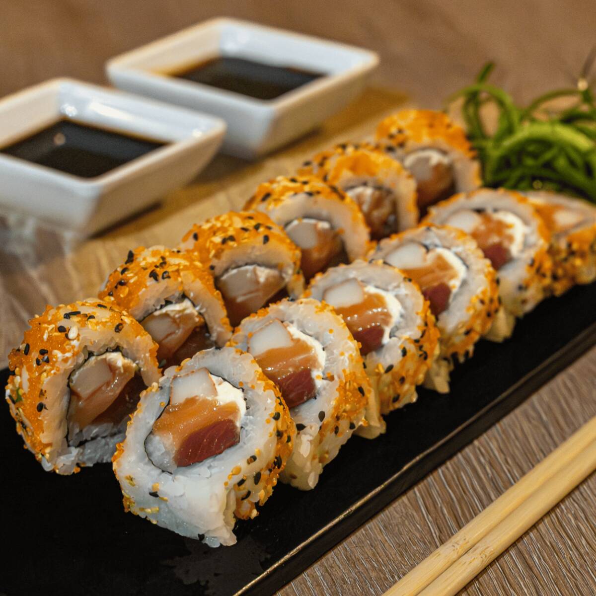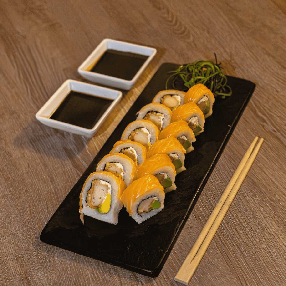 Roll relleno de salmón, atún y palmito kanikama con queso crema, coronado con topping de masago y acompañado con teriyaki.