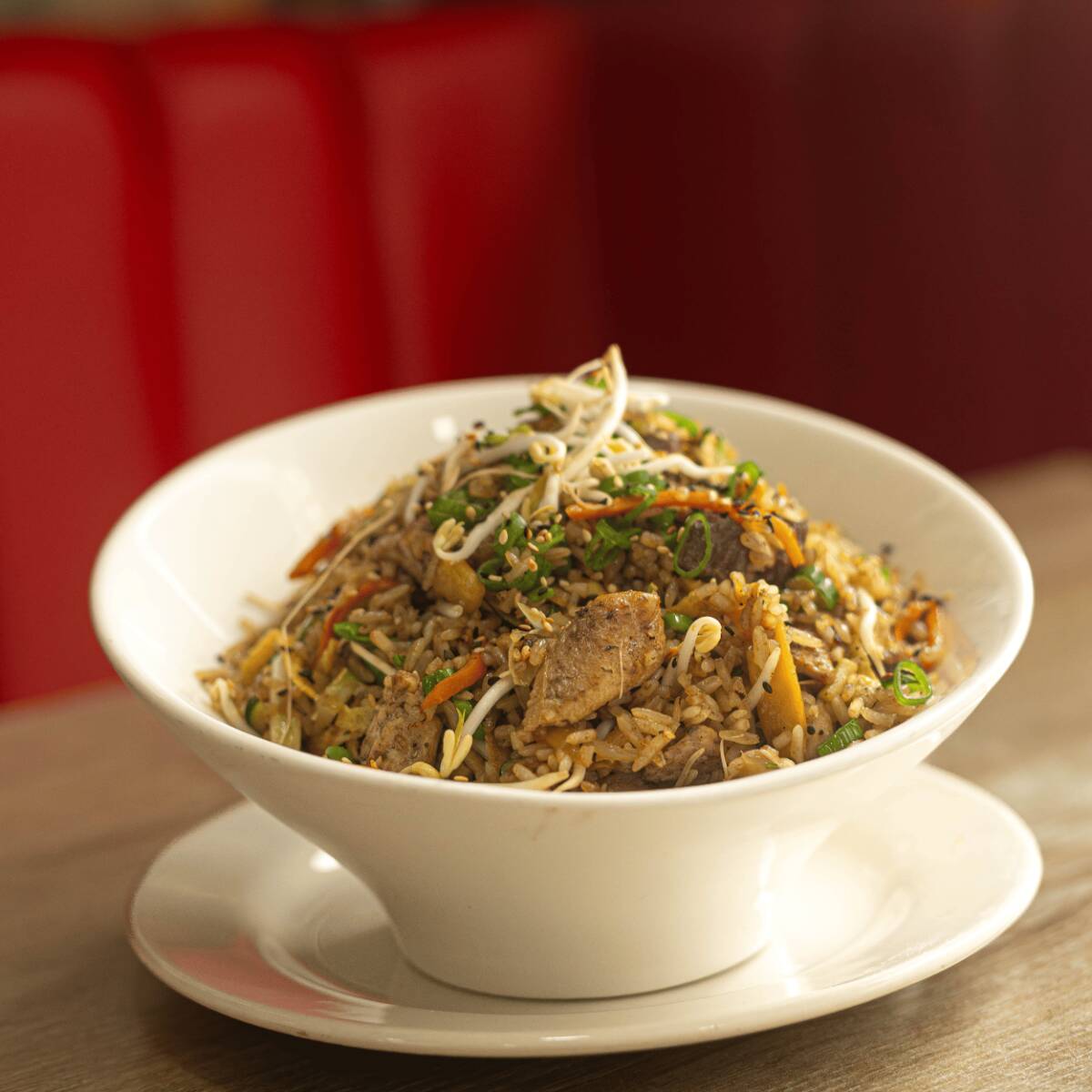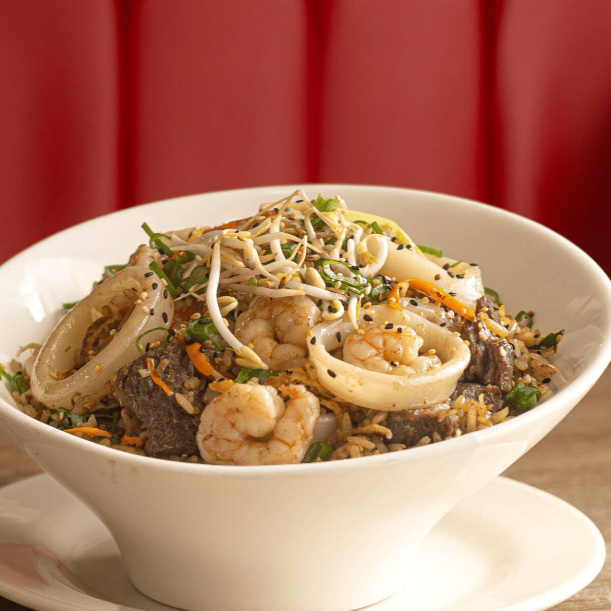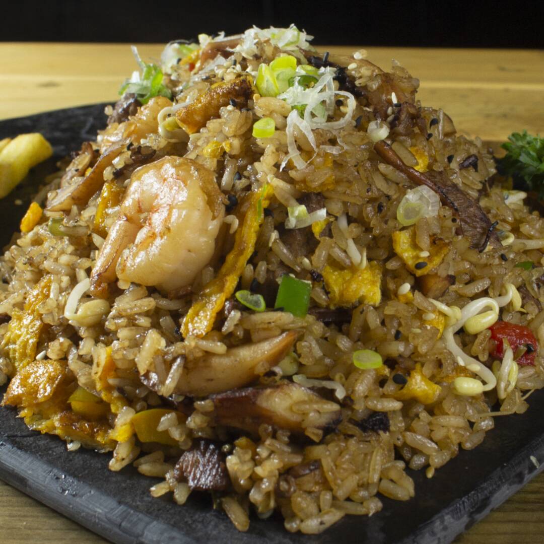 Nuestro arroz insignia salteado al wok con camarón, calamar, mejillones y jugoso lomo de res, mezclado con mix de vegetales frescos raíces, tortilla de huevo y un toque de especias. Servido con crujientes papas a la francesa que complementan perfectamente esta deliciosa combinación de sabores.