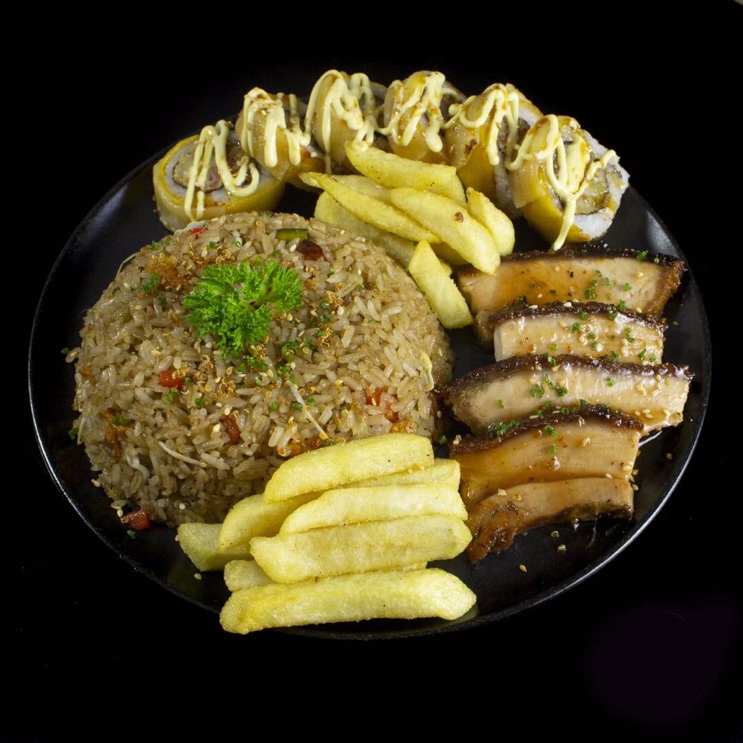 Arroz salteado, 6 piezas de tiger roll tempura, lomo salteado con vegetales, 3 croquetas de cangrejo.