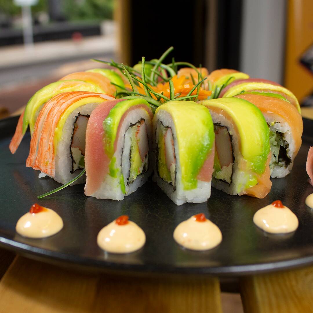 Colorido roll relleno de palmito kanikama, pepino, aguacate y queso crema, coronado con topping de pescados fresco y ajonjolí.
