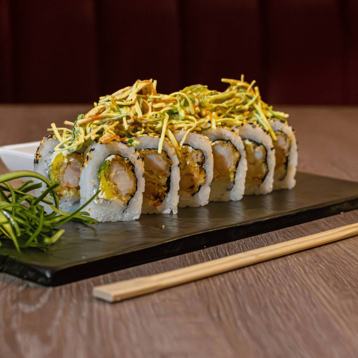 Roll relleno de queso crema y aguacate con langostinos tempura, acompañado de ensalada de la casa y bañado con salsas Fuji y teriyaki.