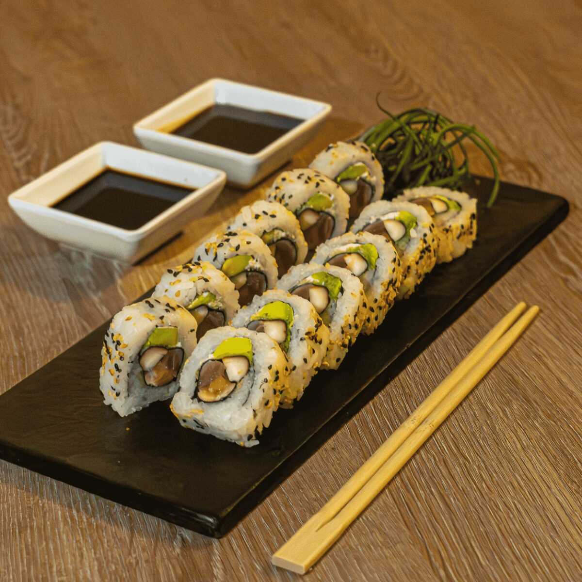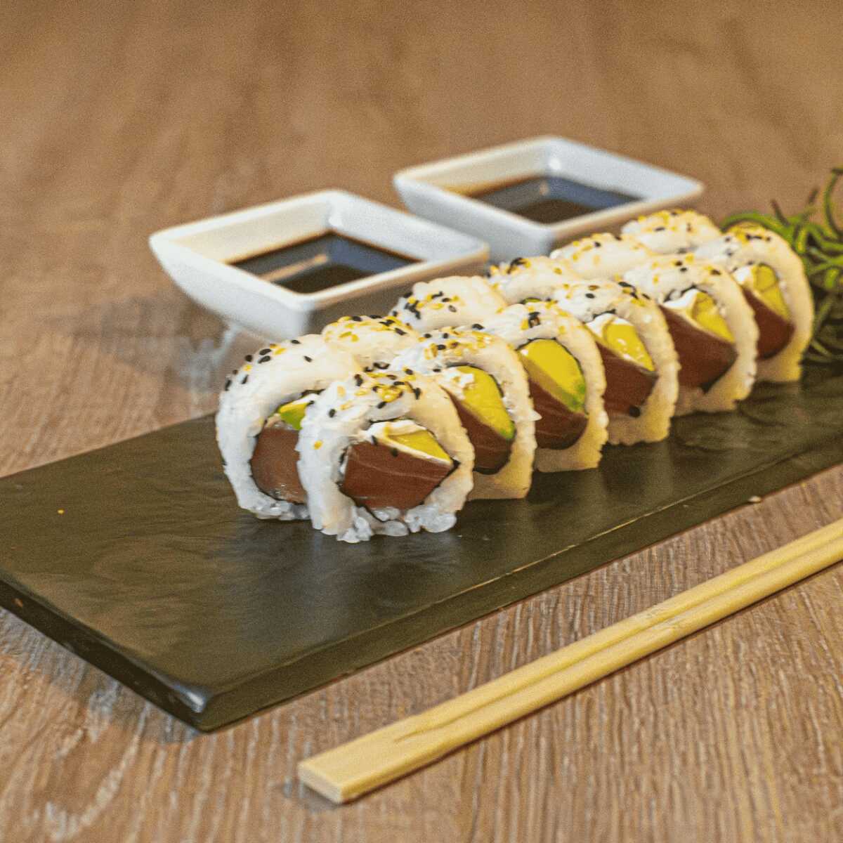 Delicado roll relleno de atún fresco, queso crema y aguacate, y toping de mix de ajonjolí tostado.