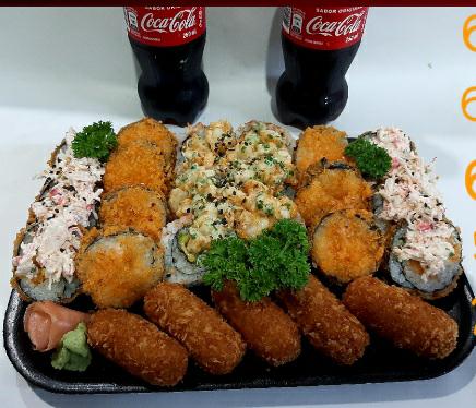 6 Piezas de philadelfia roll, 6 piezas de dinamita roll, 6 piezas de yamato roll, 6 piezas de ebi abocado roll, 5 unidades de croquetas de cangrejo.