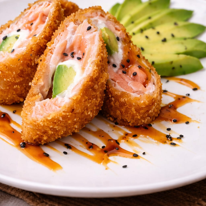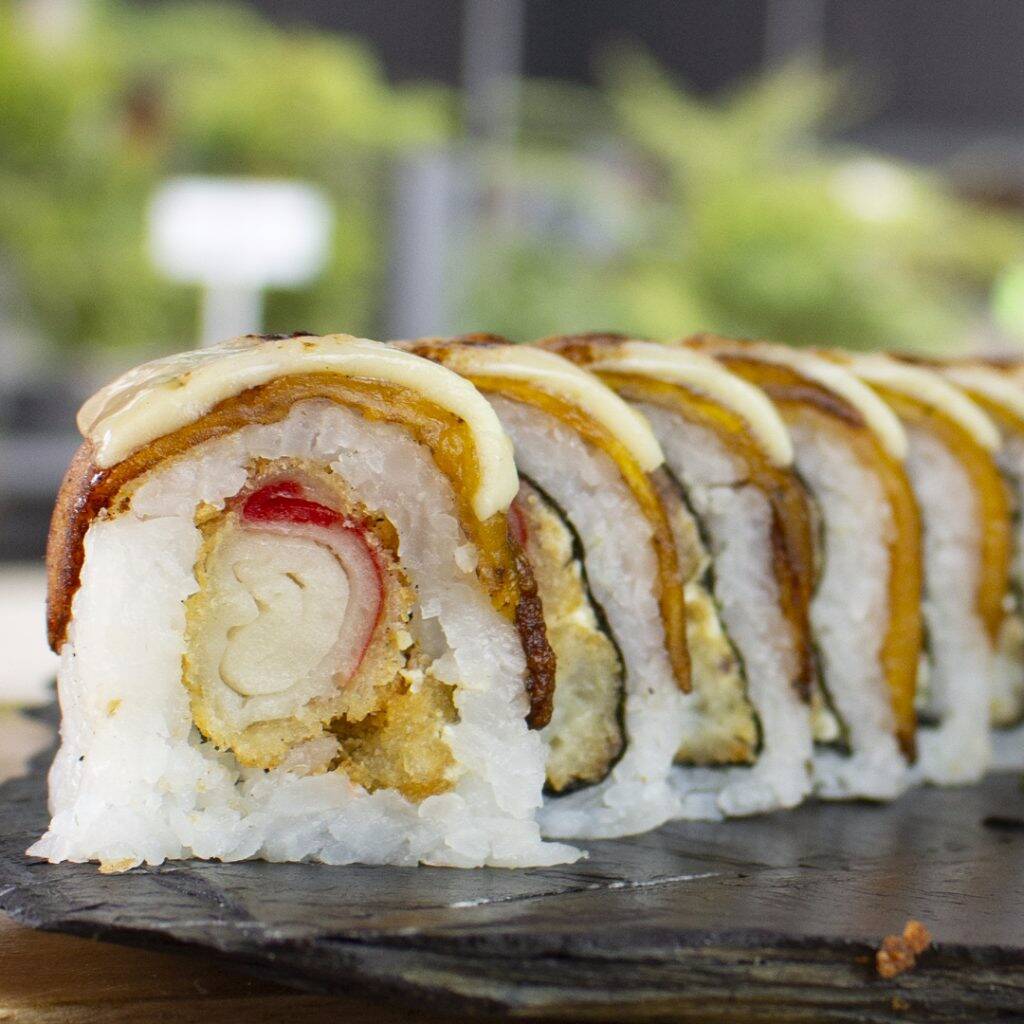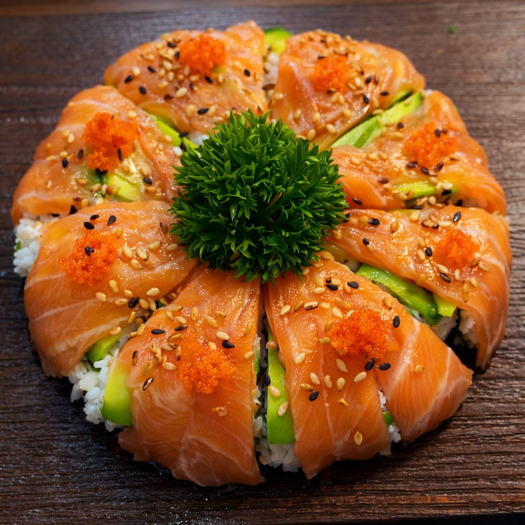 Centro de palmito, salmón, atún, tempura, masago y toping de ajonjolí.