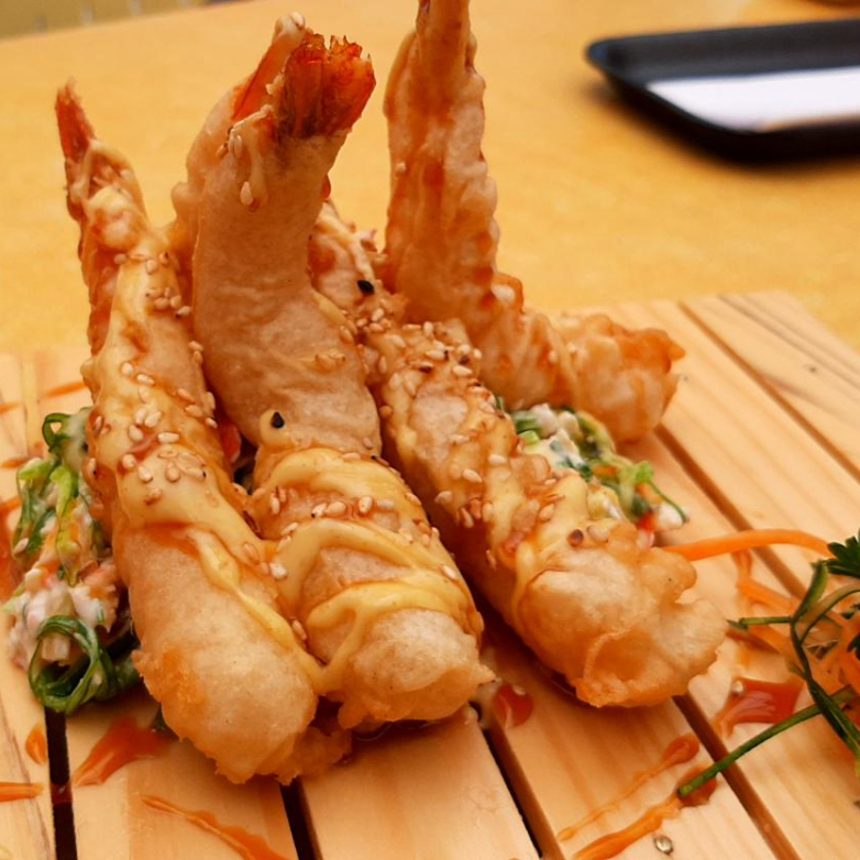 Cinco camarones apanados dorados y crocantes, acompañados de ensalada fresca de la casa y bañados con salsa mayo spicy y teriyaki.