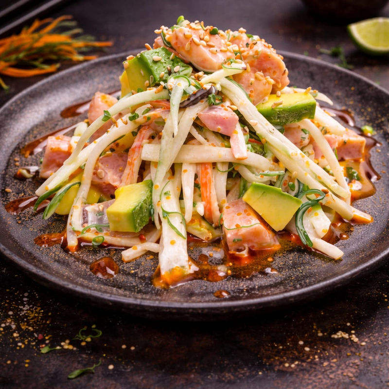 Ensalada de palmitos de cangrejo, queso crema, aguacate, kanikama, wakame y mayonesa japonesa.