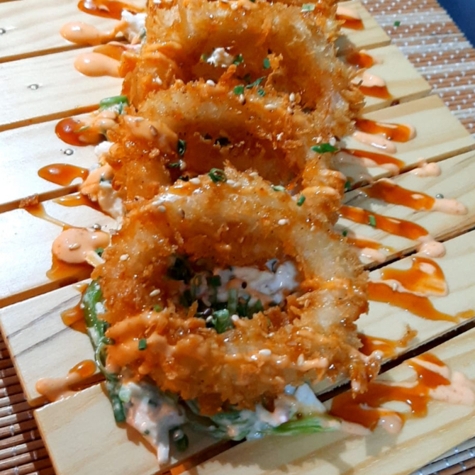 Cinco anillos de calamar apanados y crujientes, acompañados con ensalada fresca de la casa y bañados con salsa mayo spicy y teriyaki