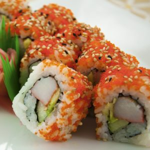 Rollo relleno de salmón pescado blanco palmito apanado con toping de masago.