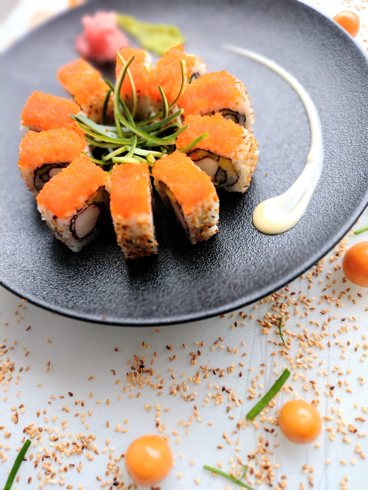 California roll con 5 toppings (mango, aguacate, coco, plátano y pepermint) + 2 kani crunch + salsa Teriyaki + 1 hashi.