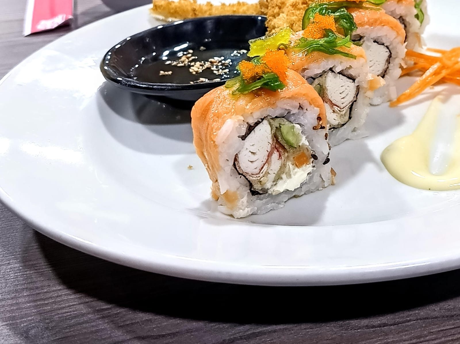 Top de salmón fresco, wakame y masago, con queso crema, cangrejo y kakiage.