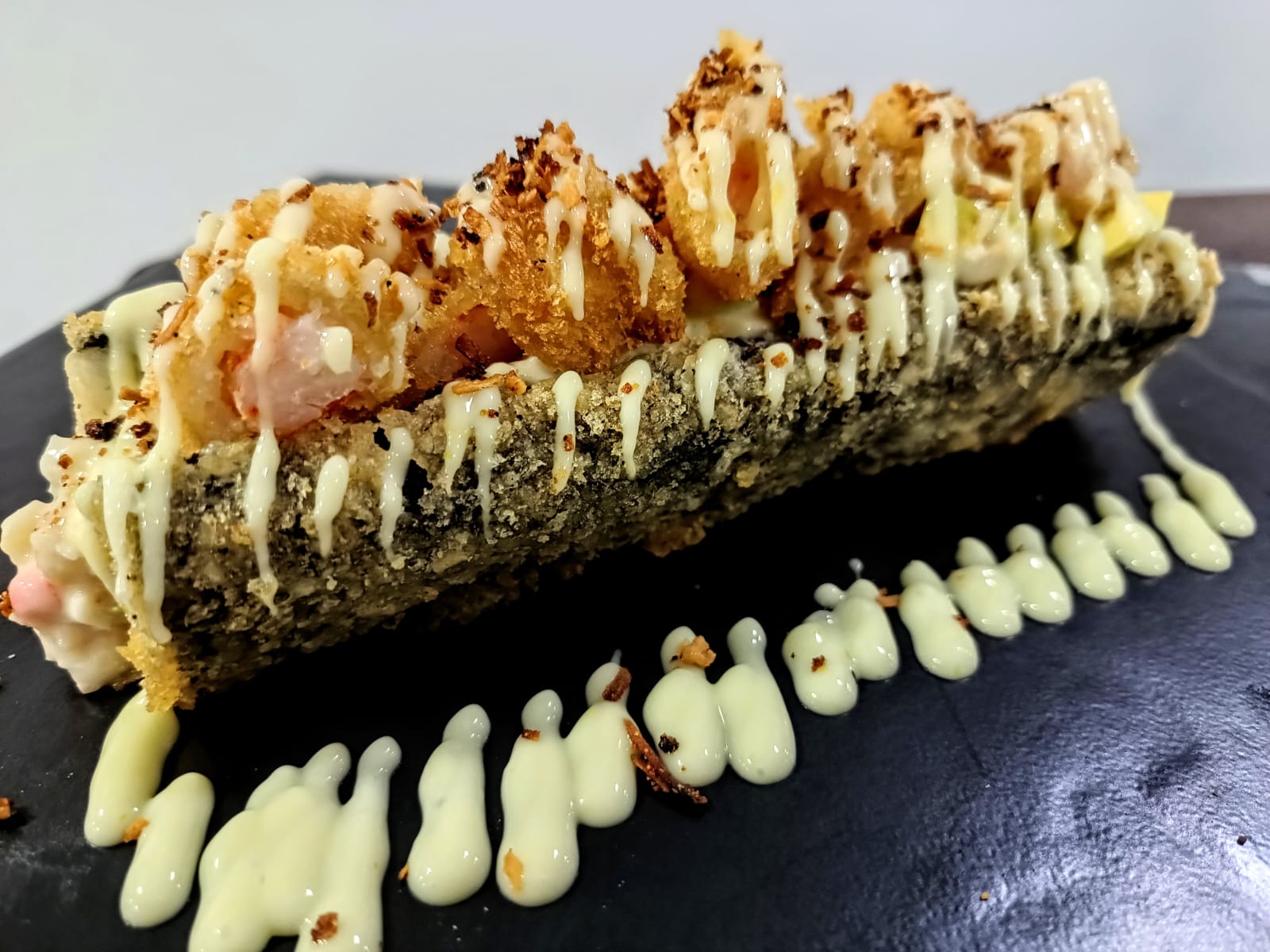Kakiage de vegetales, lechuga y queso crema, con topping de ralladura de coco y julianas en plátano.