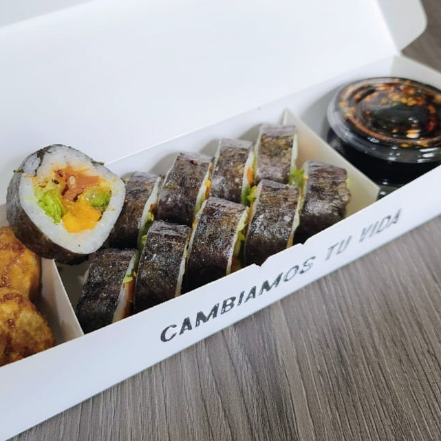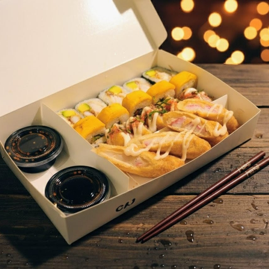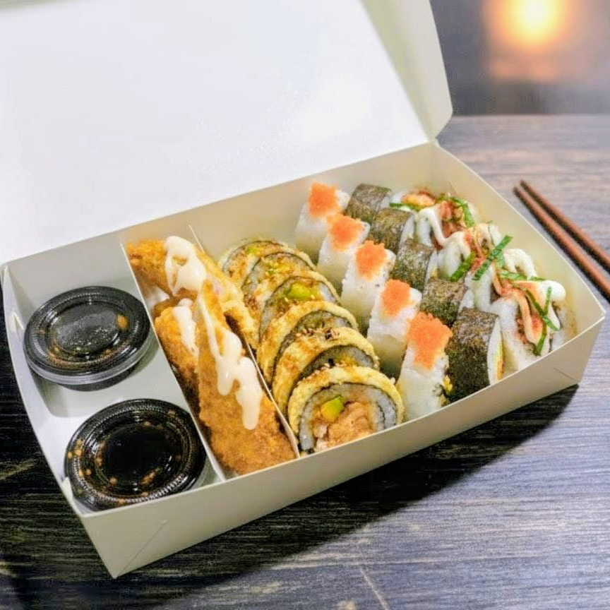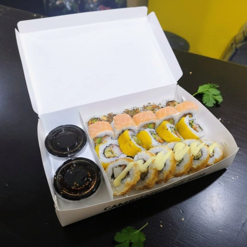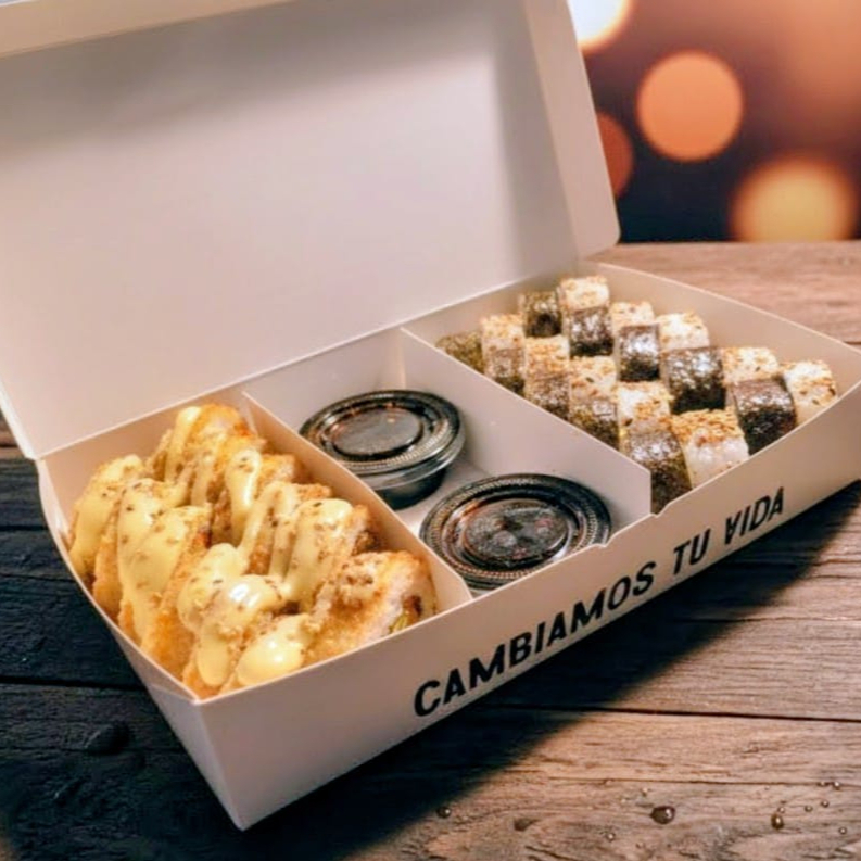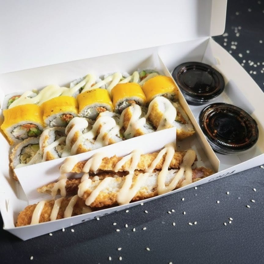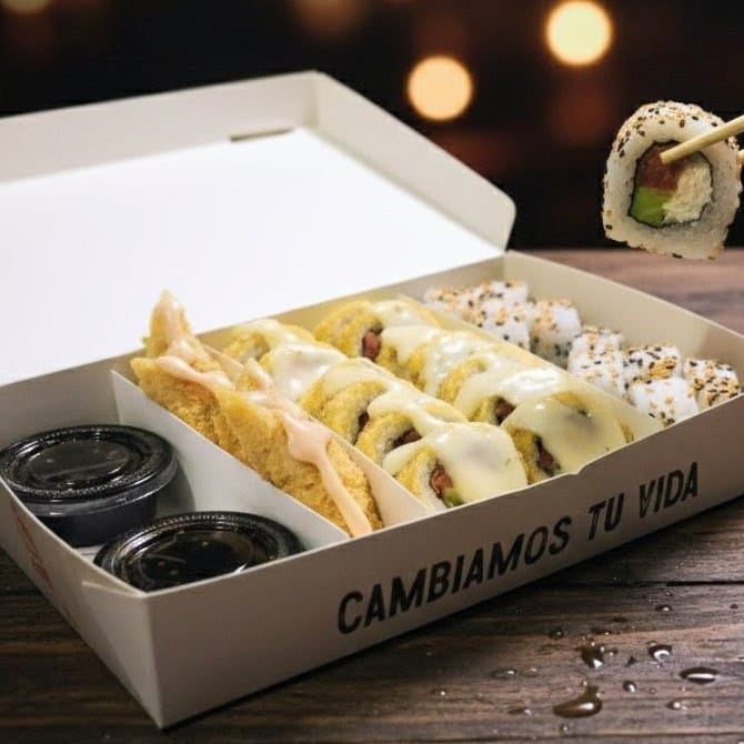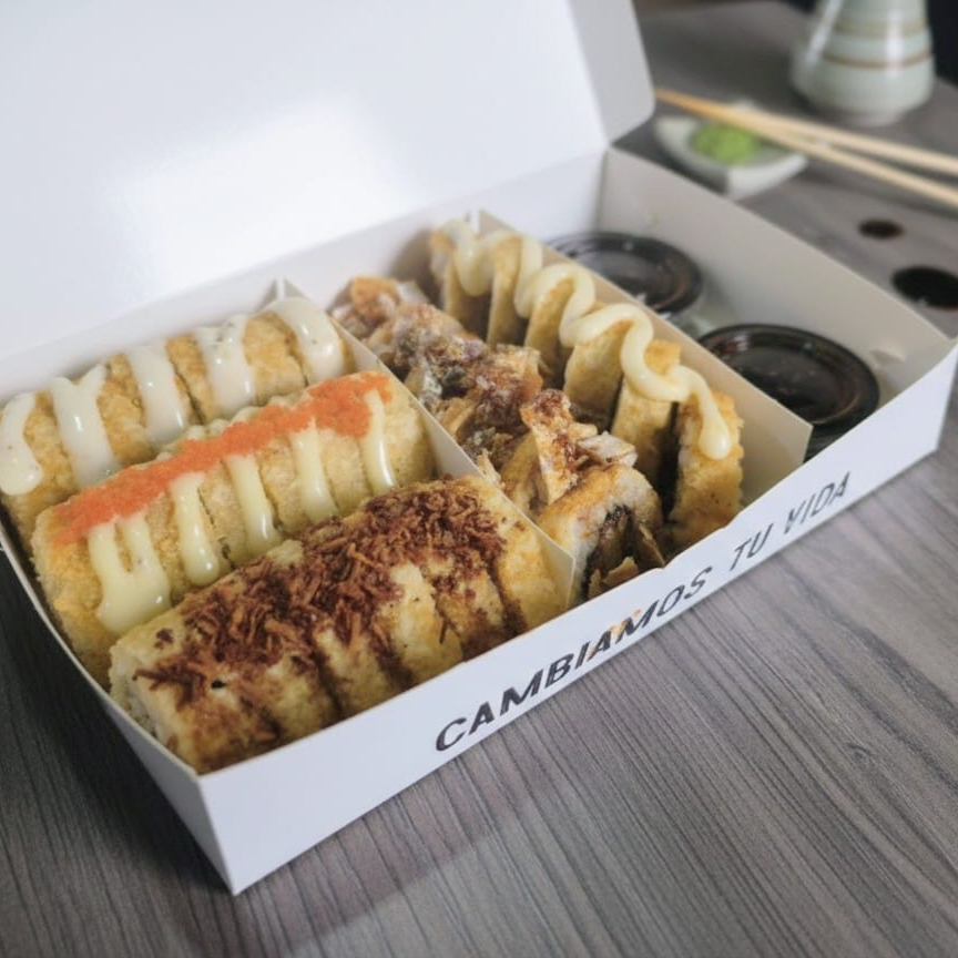 10 BOCADOS CON PESCADO BLANCO TEMPURA, QUESO CREMA Y AGUACATE, AL ESTILO FUTOMAKI. INCLUYE 1 SALSA DE SOYA + 1 SALSA TERIYAKI + 1 HASHI (PALITO) + 1 BEBIDA DE 250ML (SABOR DISPONIBLE DEL DIA).