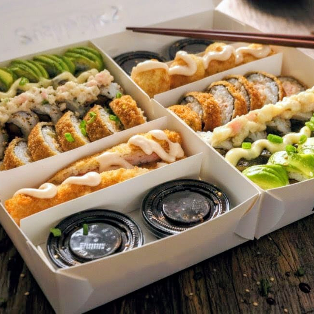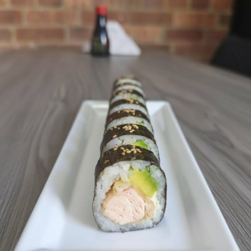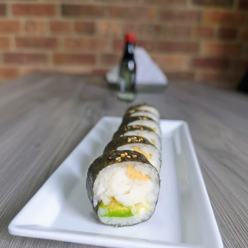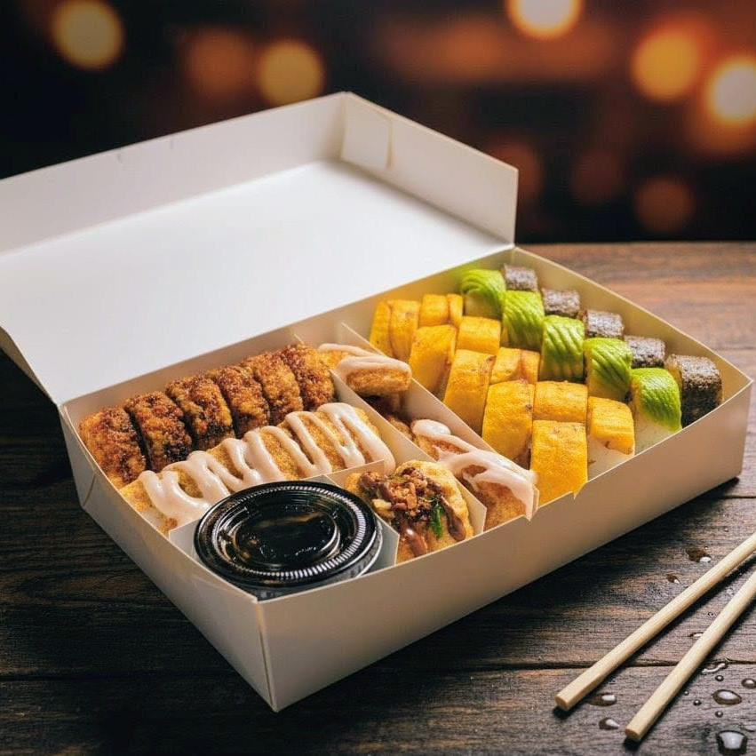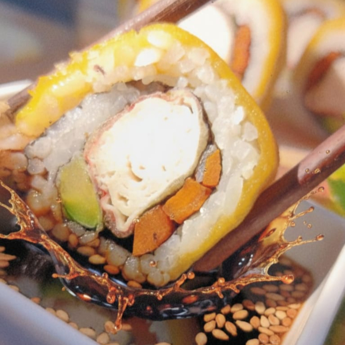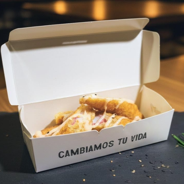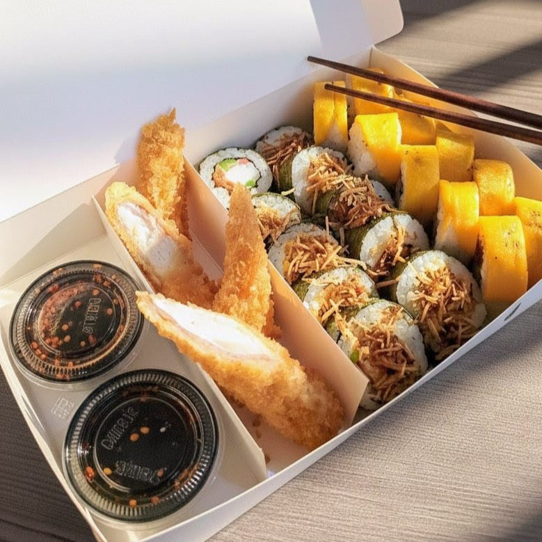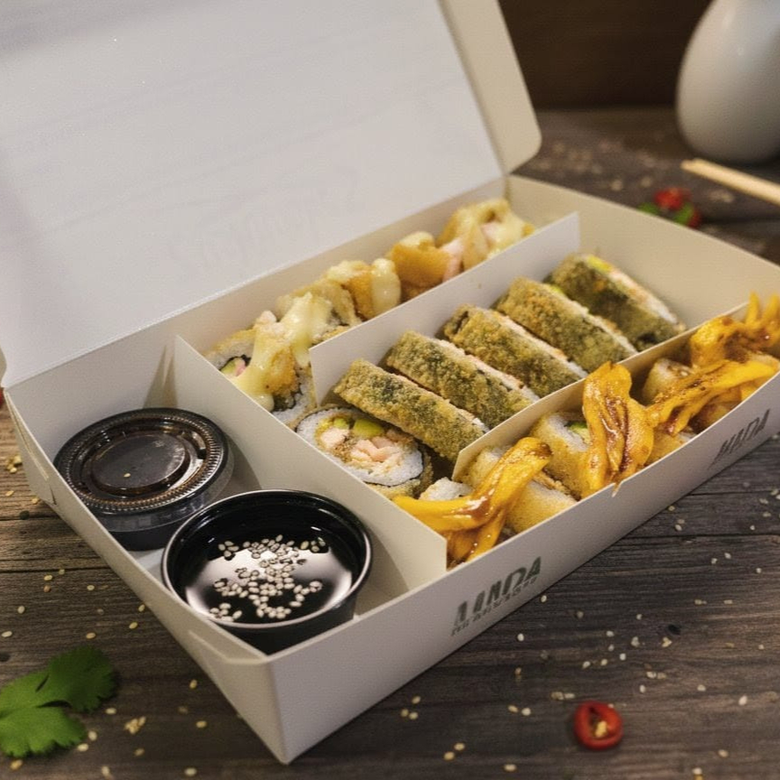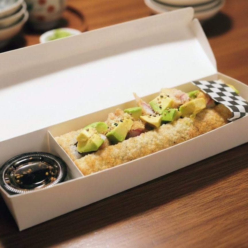 10 BOCADOS CON PESCADO BLANCO TEMPURA, QUESO CREMA Y AGUACATE, AL ESTILO FUTOMAKI. INCLUYE 1 SALSA DE SOYA + 1 SALSA TERIYAKI + 1 HASHI (PALITO) + 1 BEBIDA DE 250ML (SABOR DISPONIBLE DEL DIA).