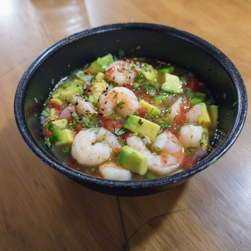 EN BASE DE LECHE DE TIGRE DE LA CASA, CAMARONES, VEGETALES DE CEVICHE Y AGUACATE.