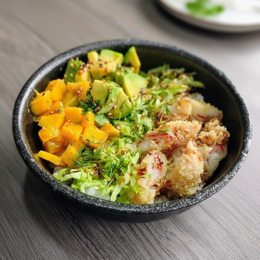 MANGO, LECHUGA, AGUACATE Y KANIKAMA CRISPY. EN BASE DE ARROZ DE SUSHI AL TERIYAKI Y CILANTRO. INCLUYE 1 CUBIERTO.