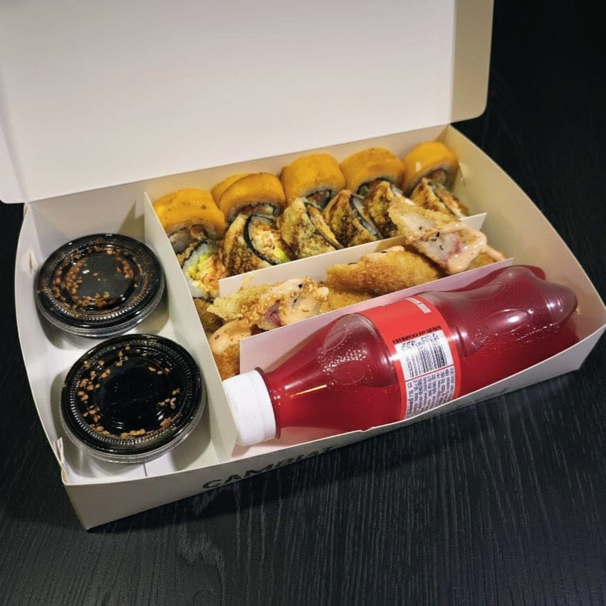 10 FISH & COCONUT ROLL + 10 PLATANO TOP + 4 KANI CRUNH (ENTRADITAS) + 2 GASEOSAS 250ML (SABOR DISPONIBLE EN TIENDA). INCLUYE 1 SOYA + 1 TERIYAKI + 2 HASHIS (PALITOS PARA COMER)