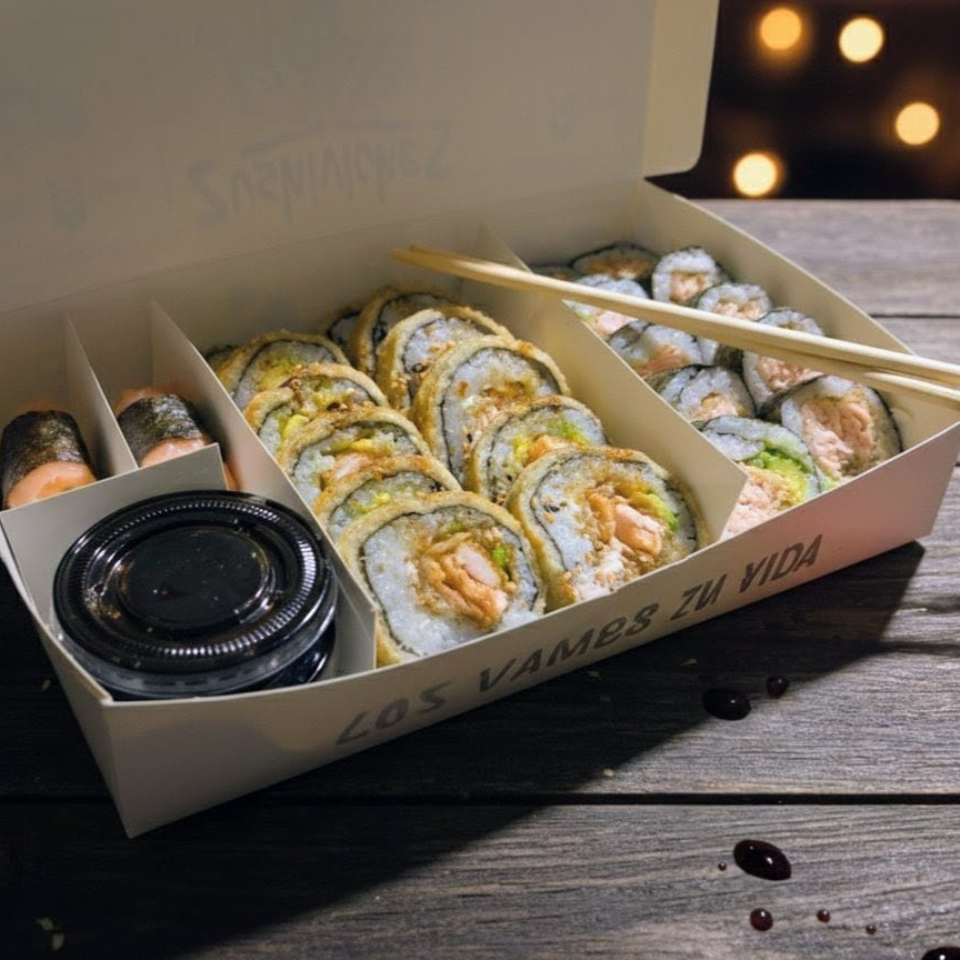 6 SALMON CRUNCH + 5 CALIFORNIA MASAGO TOP + 5 CALIFRONIA PEPPERMINT + 5 SALMON ROLL + 4 KANI CRUNH (ENTRADITAS). INCLUYE 1 SOYA + 1 TERIYAKI + 1 HASHI (PALITO PARA COMER)