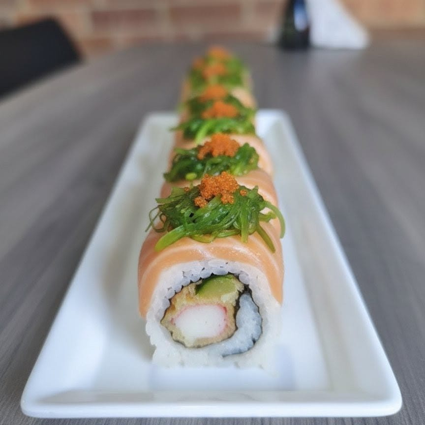10 BOCADOS CON KANIKAMA, QUESO CREMA Y KAKIAGE, CON TOP DE SALMON FRESCO, WAKAME Y MASAGO. INCLUYE 1 SALSA DE SOYA + 1 SALSA TERIYAKI + 1 HASHI (PALITO) + 1 BEBIDA DE 250ML (SABOR DISPONIBLE DEL DIA).