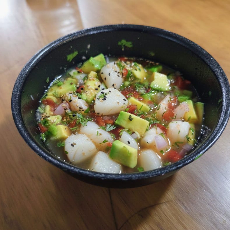 EN BASE DE LECHE DE TIGRE DE LA CASA, PESCADO BLANCO, VEGETALES DE CEVICHE Y AGUACATE.