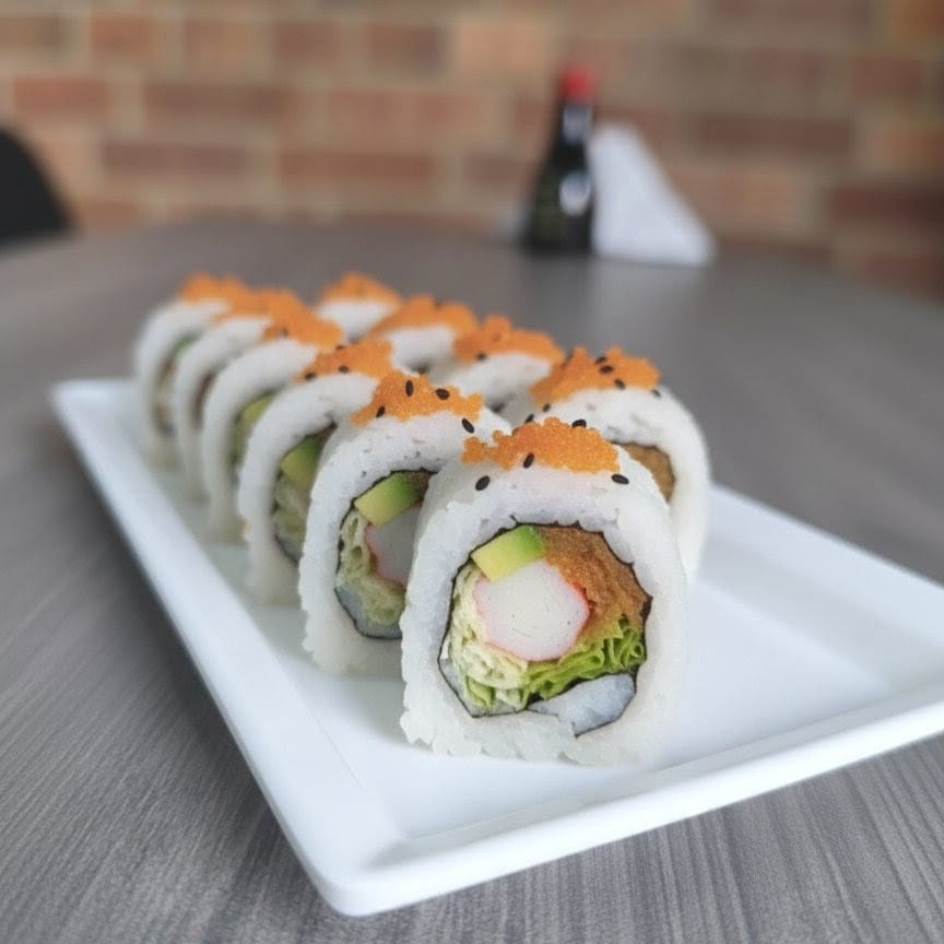 10 BOCADOS CON KANIKAMA, QUESO CREMA Y KAKIAGE, CON TOP DE MASAGO. INCLUYE 1 SALSA DE SOYA + 1 SALSA TERIYAKI + 1 HASHI (PALITO) + 1 BEBIDA DE 250ML (SABOR DISPONIBLE DEL DIA).