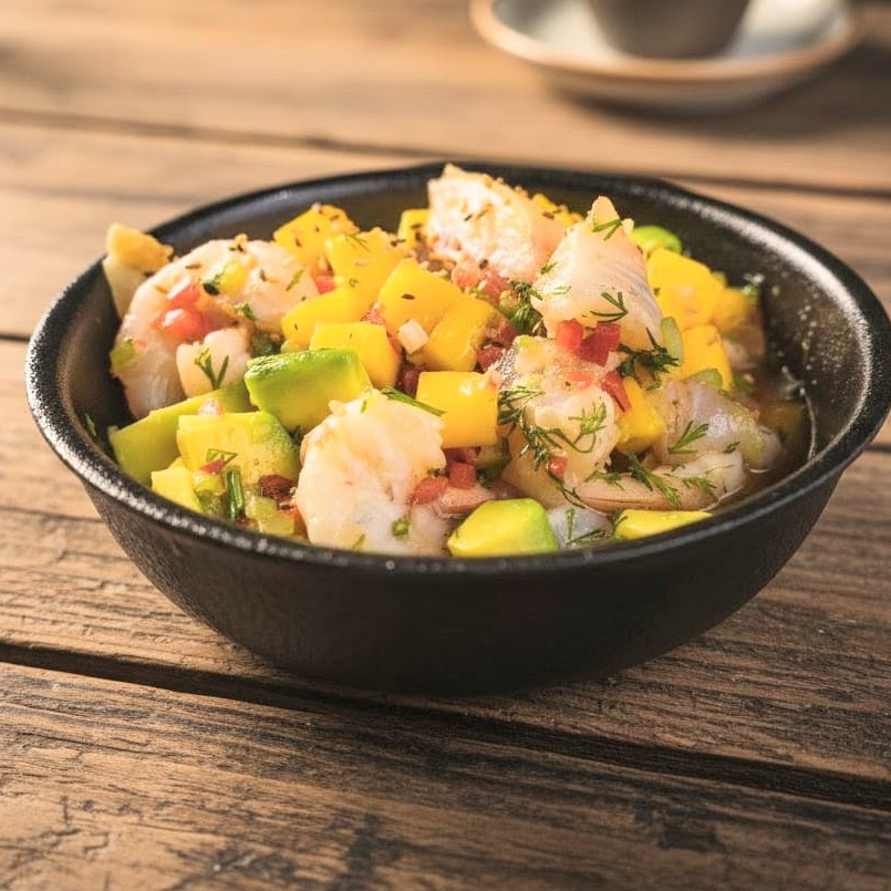 EN BASE DE LECHE DE TIGRE DE LA CASA, PESCADO BLANCO, CAMARONES Y PALMITO DE CANGREJO, VEGETALES DE CEVICHE Y AGUACATE