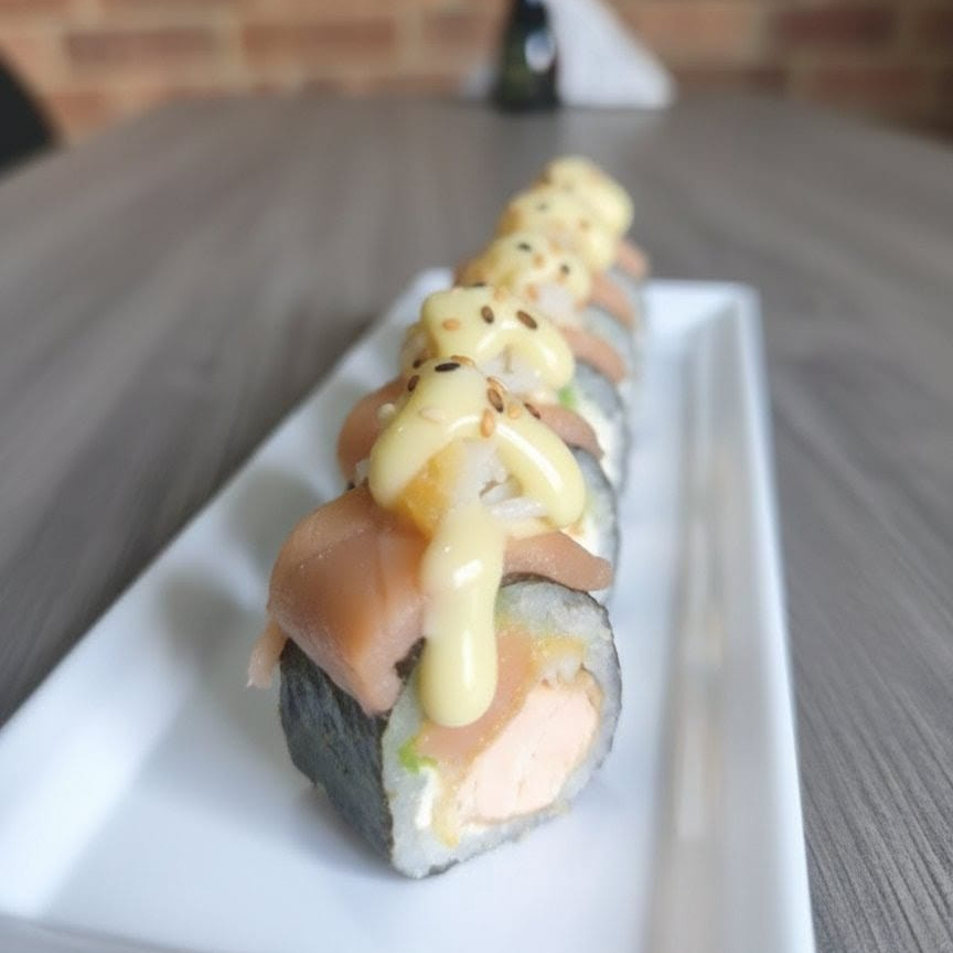 10 BOCADOS CON SALMON TEMPURA Y QUESO CREMA, CON TOP DE SALMON FRESCO, CROCANTE DE CAMARONES Y SALSA MIEL MOSTAZA. INCLUYE 1 SALSA DE SOYA + 1 SALSA TERIYAKI + 1 HASHI (PALITO) + 1 BEBIDA DE 250ML (SABOR DISPONIBLE DEL DIA).