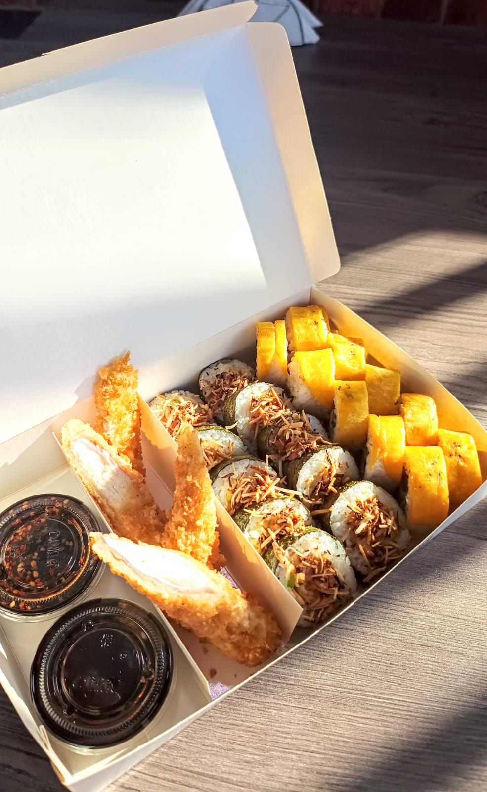 Recibes 12 California Hawaii tempura + 10 California roll tradicional + 4 cachitos de cangrejo.